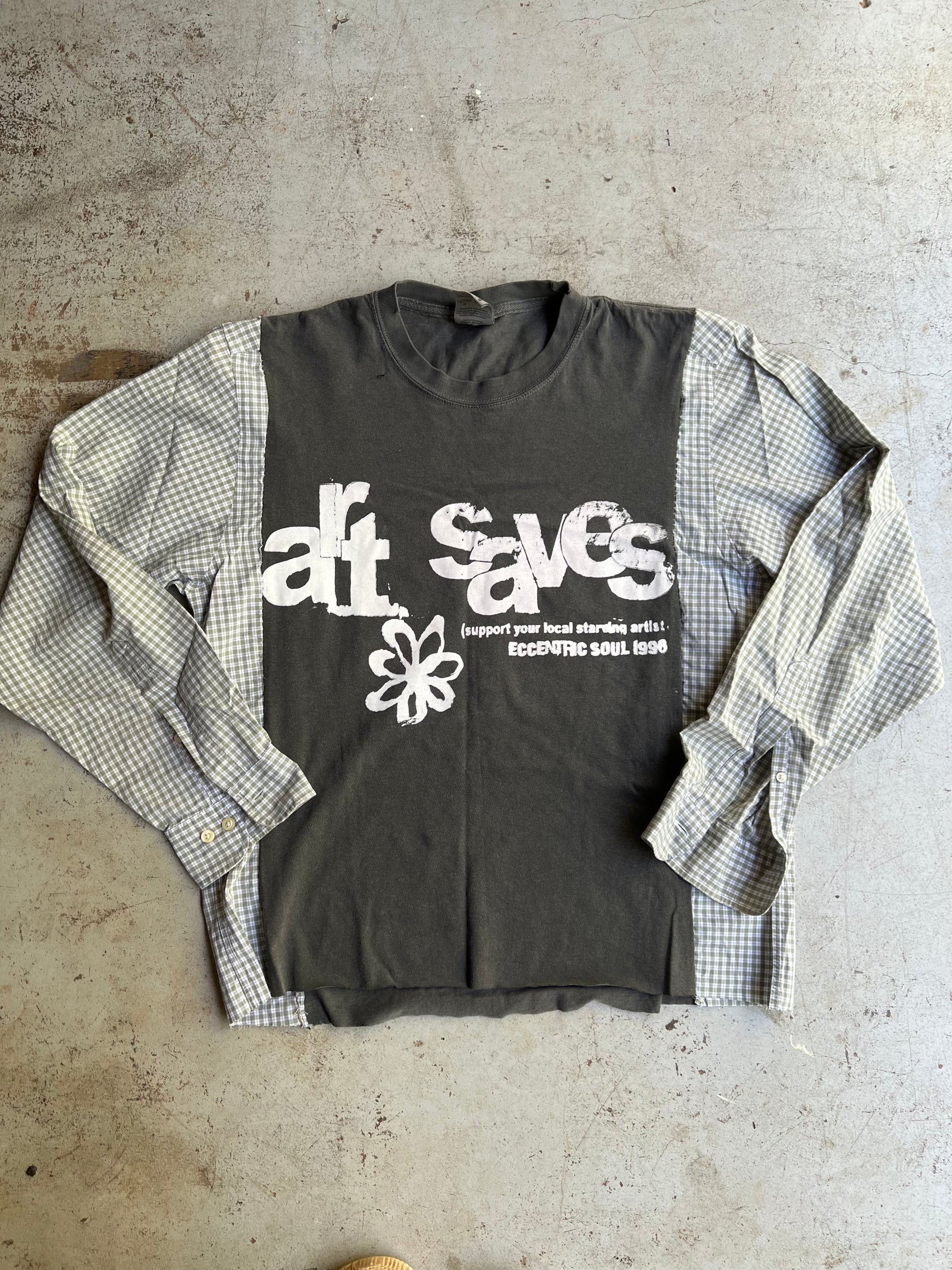 A 1 of 1 hand screen printed flannel tee. Features the art saves graphic along with hand stitched flannel sleeves. Size Large