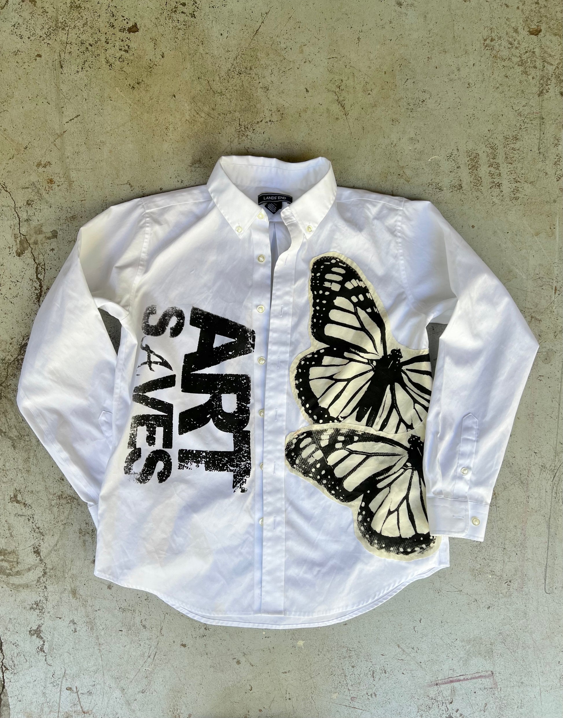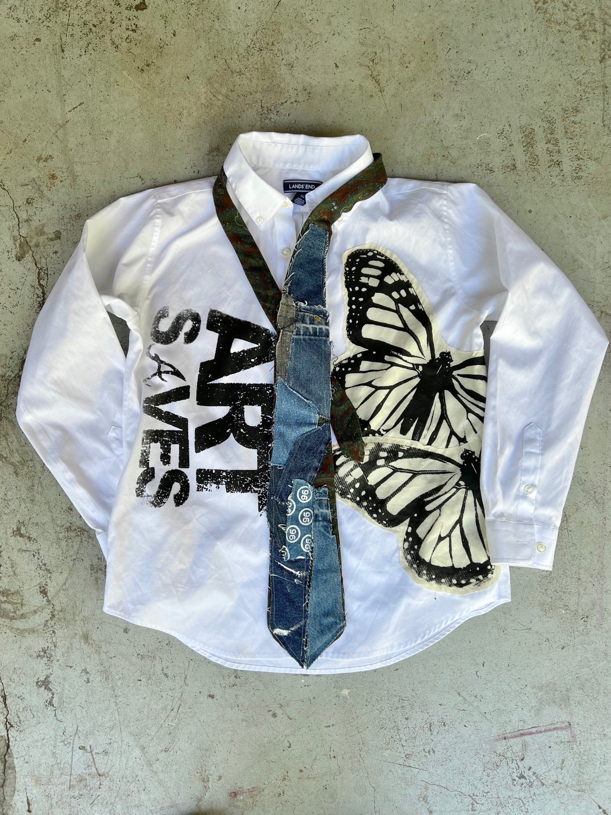 Custom 1 of 1 white button up. Features hand screen printed butterfly graphic. Size small. (Tie not included)