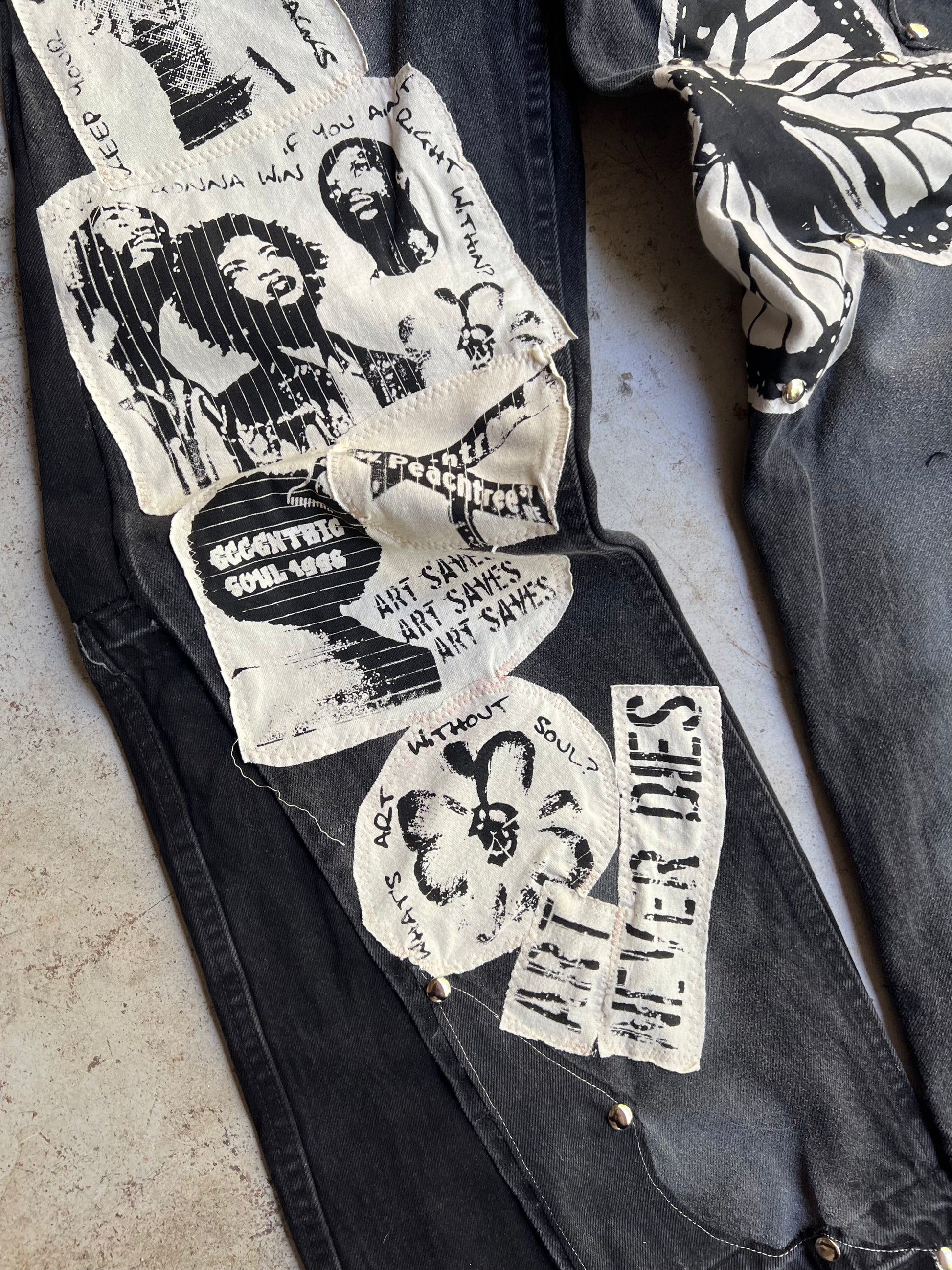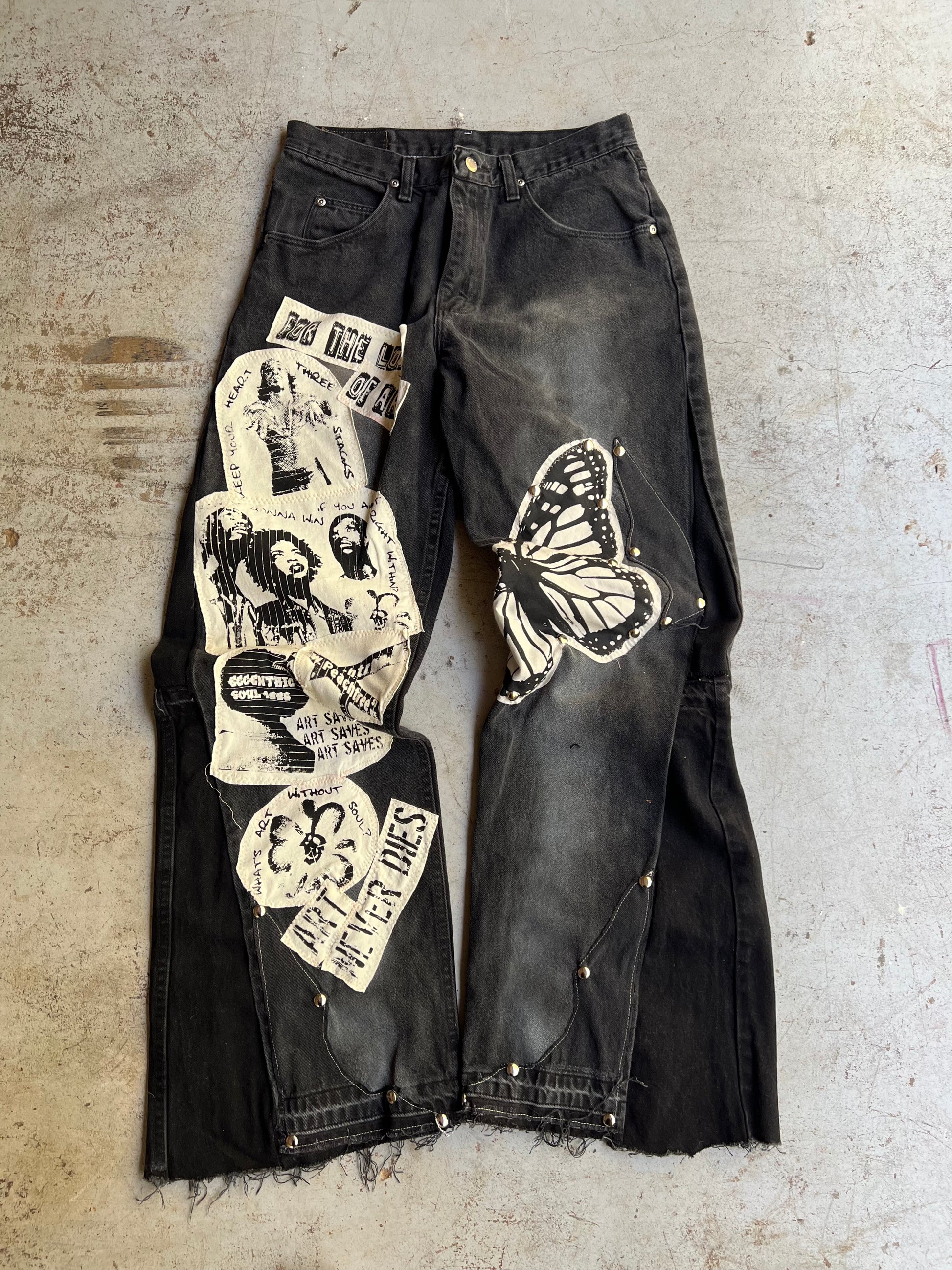 A custom 1 of 1 pair of denim of denim jeans with hand screen printed graphics. Also featured handset studs and custom leg flares that give a baggy fit. Size 32 x 32.